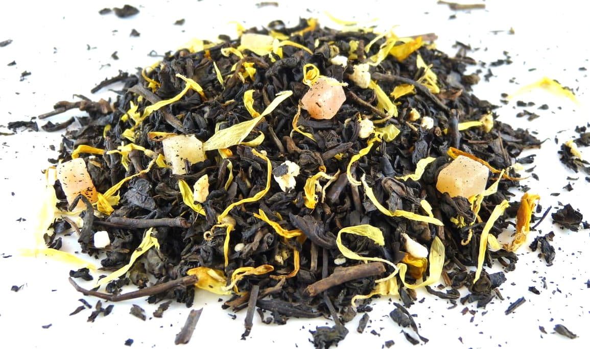Orzeźwiająca herbata Pu-Erh z dodatkiem owoców papai i brzoskwini oraz płatków nagietka