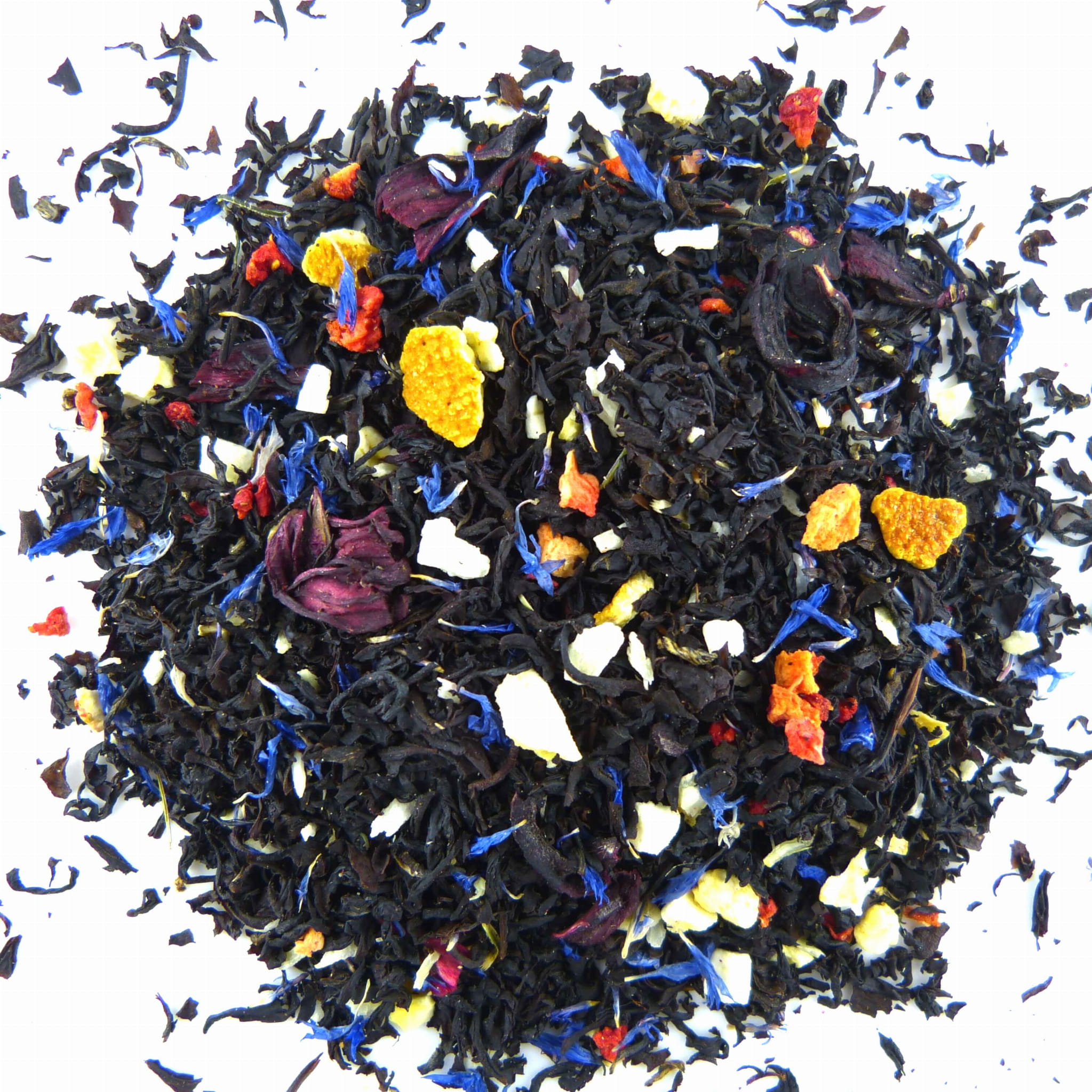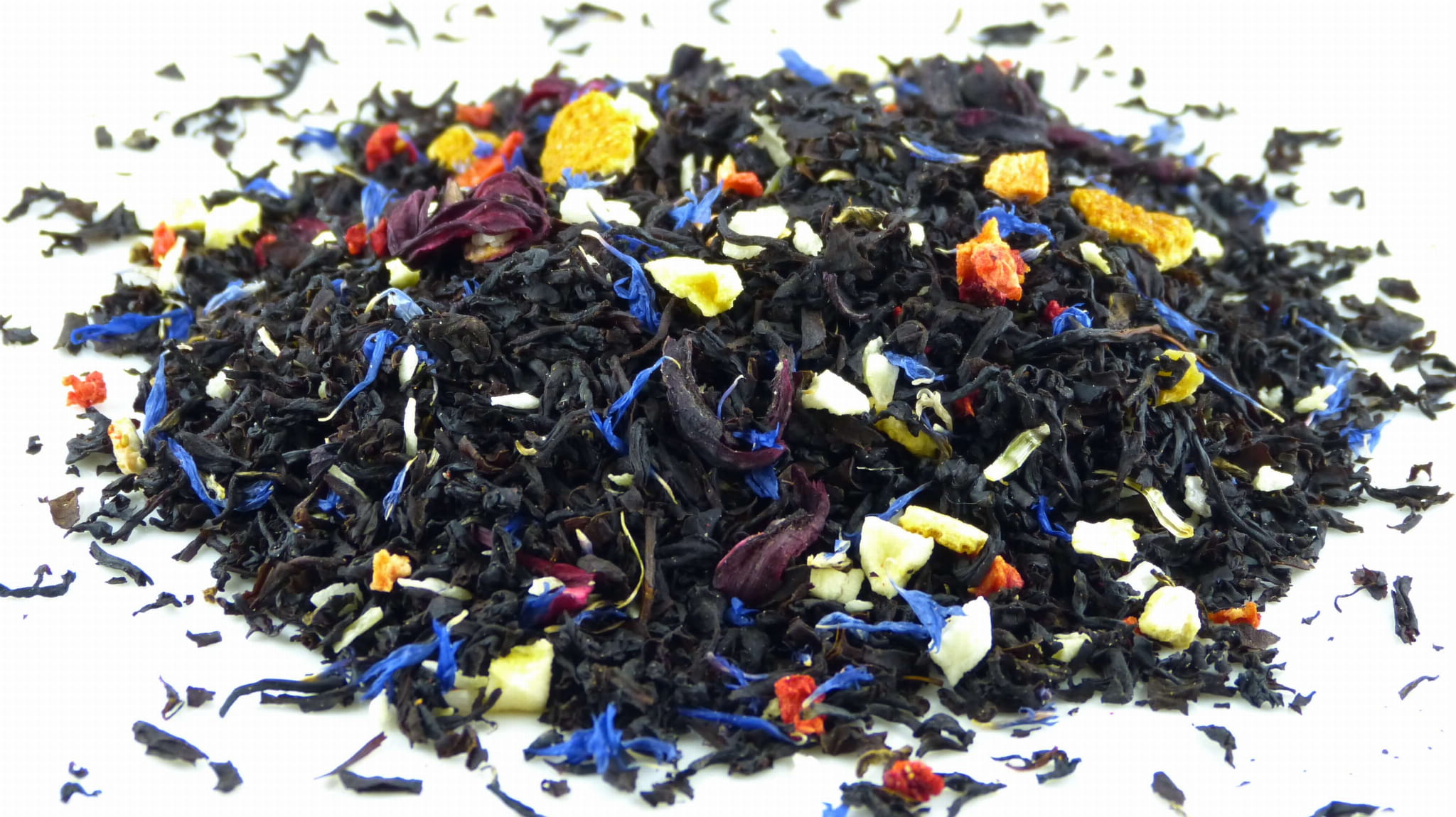 - Skład: Herbata czarna Assam FOP, wiórki kokosowe, suszona skórka pomarańczy, olejek bergamotowy, mango liofilizowane, truskawka liofilizowana, płatki bławatka, hibiskus.