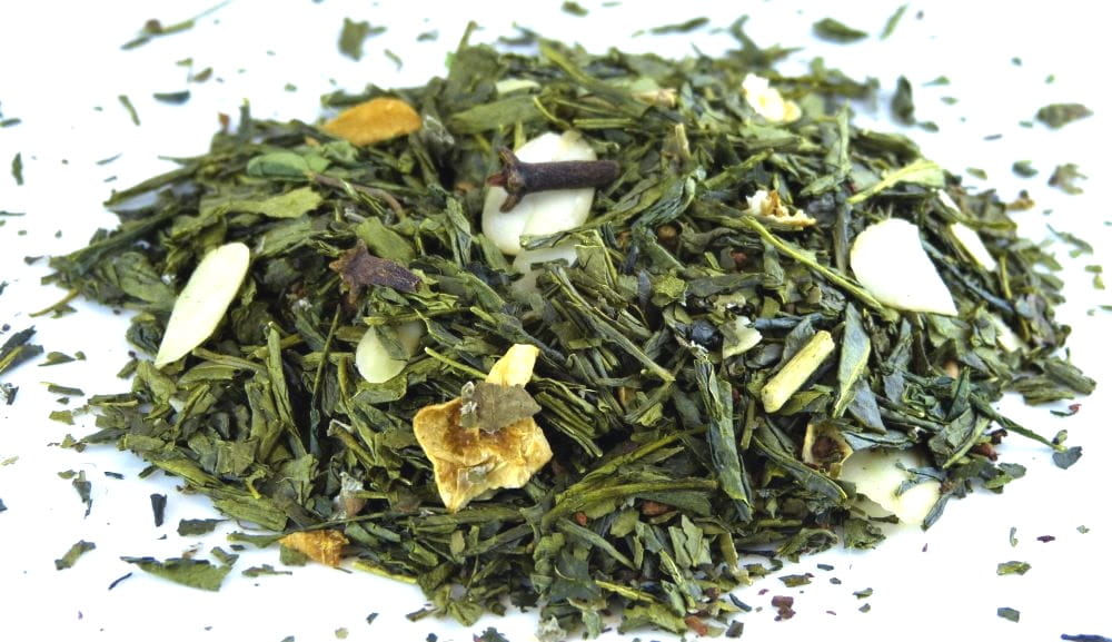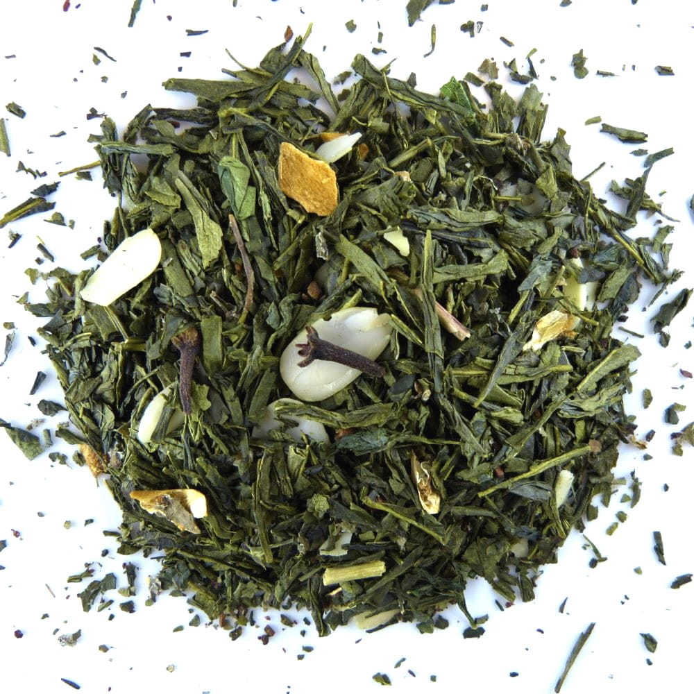 - Skład: herbata zielona Sencha, cynamon, migdał w płatkach, suszona skórka pomarańczy, goździki, aromat, liść maliny.