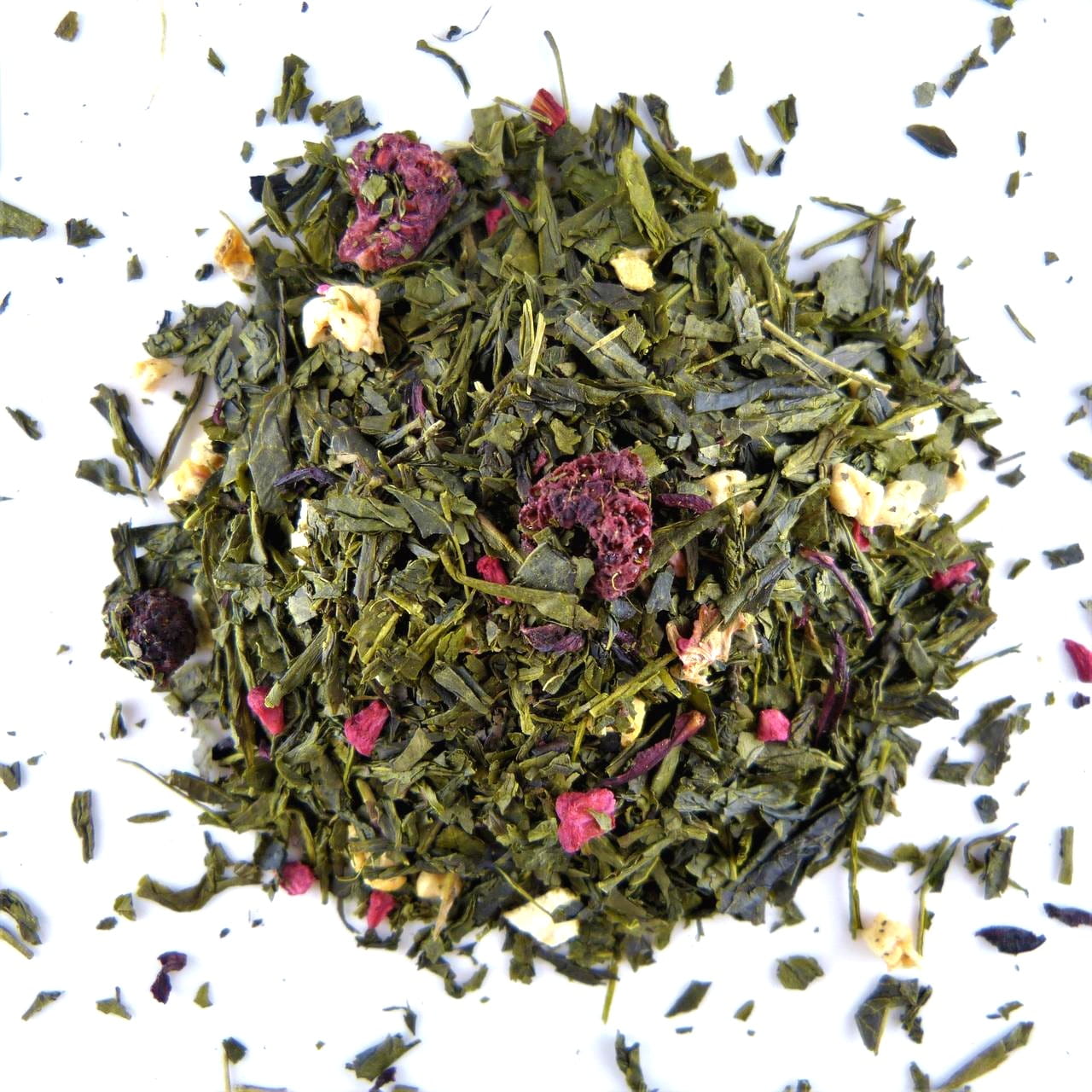 - Skład: Herbata zielona Sencha, hibiskus, aromat, suszona skórka pomarańczy, malina suszona cała, jabłko suszone, liofilizowana malina grys.