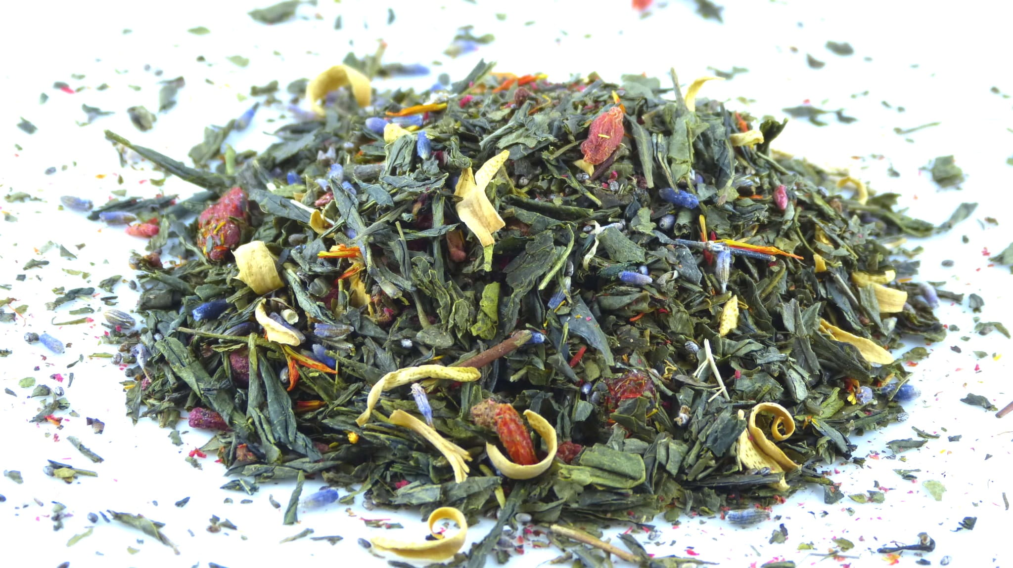 - Skład: herbata zielona Sencha, nasiona chia, suszone owoce goji, suszona skórka pomarańczy, lawenda, aromat, kwiat pomarańczy, malina liofilizowana grys, kwiat granatu.