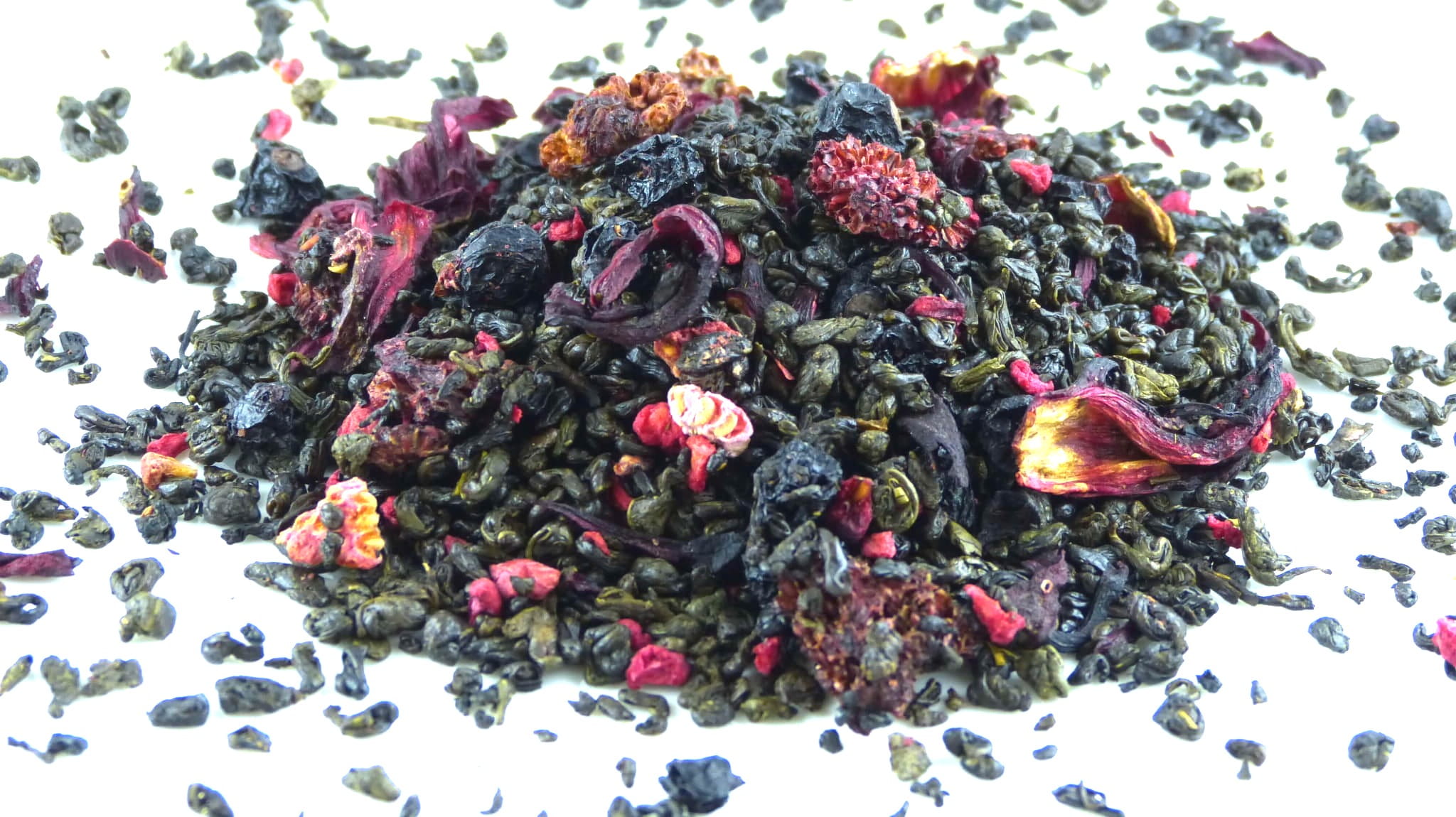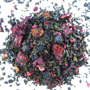 Herbata zielona typu Gunpowder Temple od Heaven wzbogacona suszoną porzeczką, hibiskusem i liofilizowaną maliną.