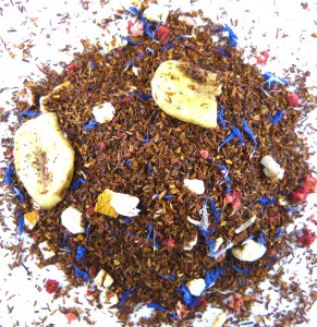 - Skład: Herbata ziołowa Rooibos, suszony banan, suszona skórka pomarańczy, mango liofilizowane grys, aromat waniliowy, truskawka liofilizowana grys, płatki bławatka