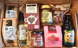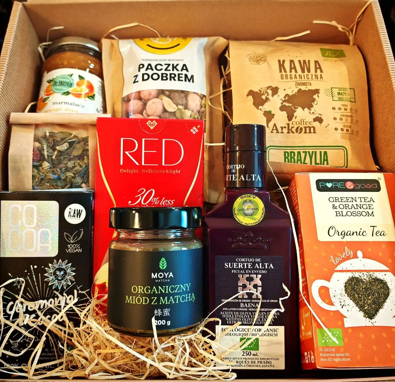 W środku może być: kawa, herbata, yerba mate, miody, różne słodycze, soki, owoce, orzechy, konfitury, zioła czy przyprawy, oliwy czy sosy. Wszystko co znajdziesz w naszym sklepie.