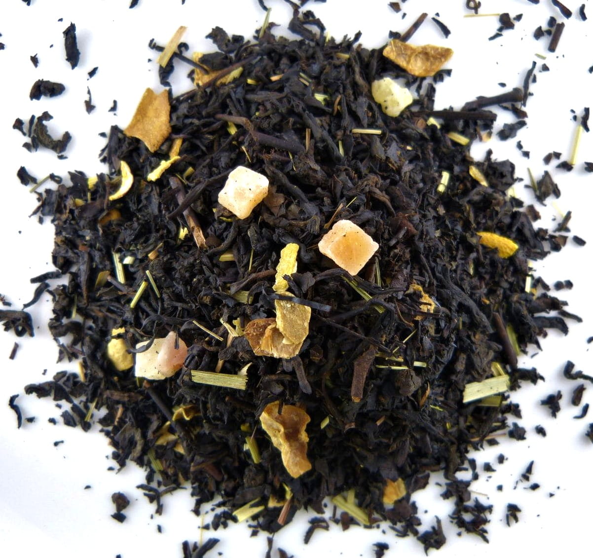 - Skład: herbata czerwona pu-erh, papaja kandyzowana, ananas kandyzowany, suszona skórka cytryny, aromat, trawa cytrynowa.