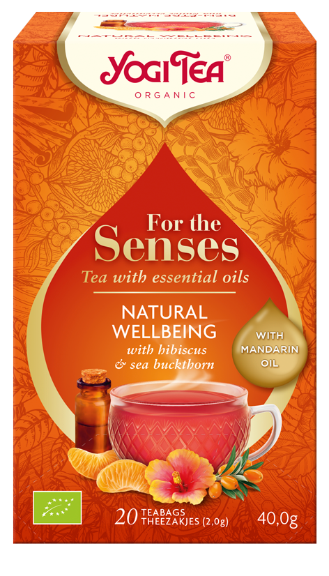 YOGI TEA® Szczęście z natury NATURAL WELLBEING ożywia zmysły owocowym olejkiem mandarynkowym. W połączeniu z pikantnym rokitnikiem i lekko cierpkim hibiskusem sprawia, że czujemy się gotowi poradzić sobie z codziennymi wyzwaniami.